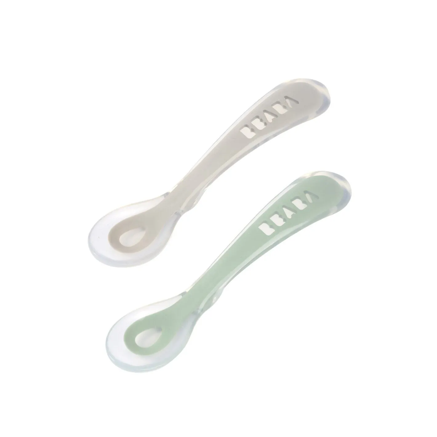 Découvrez la cuillère 2ème âge en silicone iconique de Béaba avec ce set de 2 cuillères dans leur coffret de transport.