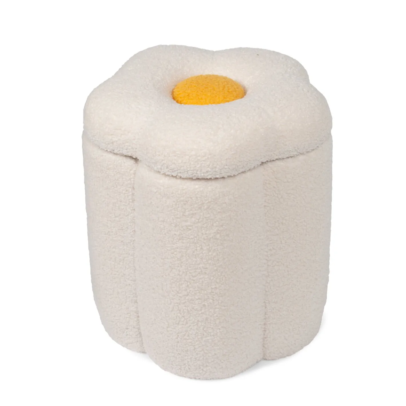 Ce magnifique pouf en forme de fleur est aussi un coffre à jouets ! Il est composé de teddy blanc cassé très tendance et de teddy jaune clair au centre.