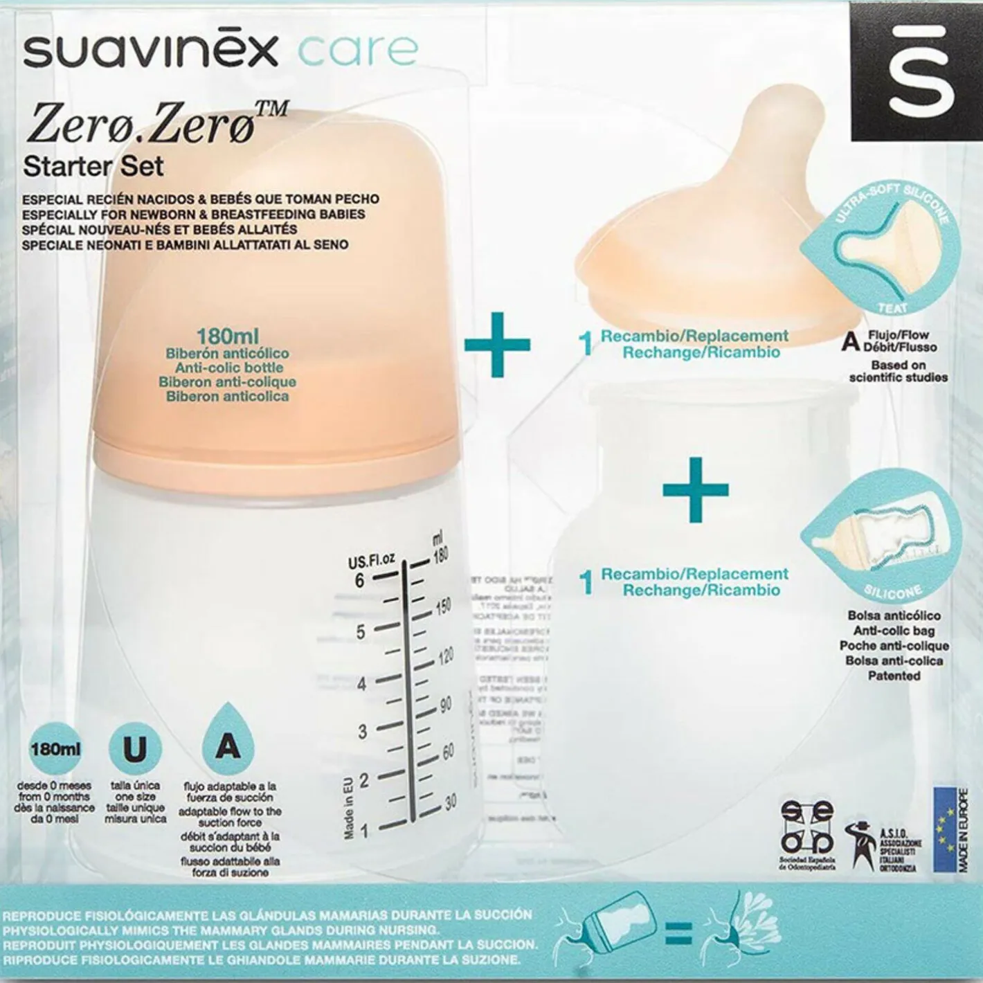 Ce pack comprend 1 biberon ZERO.ZERO 180 ml, une poche en silicone supplémentaire ainsi qu’une tétine spéciale allaitement (A) de rechange.