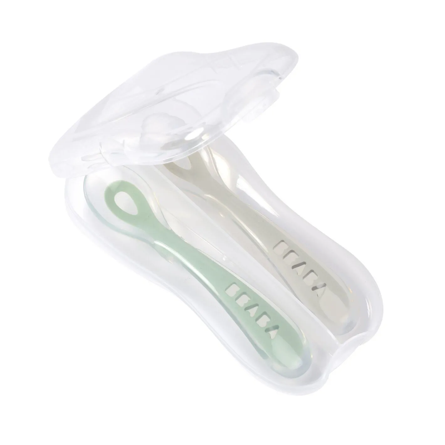 Découvrez la cuillère 2ème âge en silicone iconique de Béaba avec ce set de 2 cuillères dans leur coffret de transport.