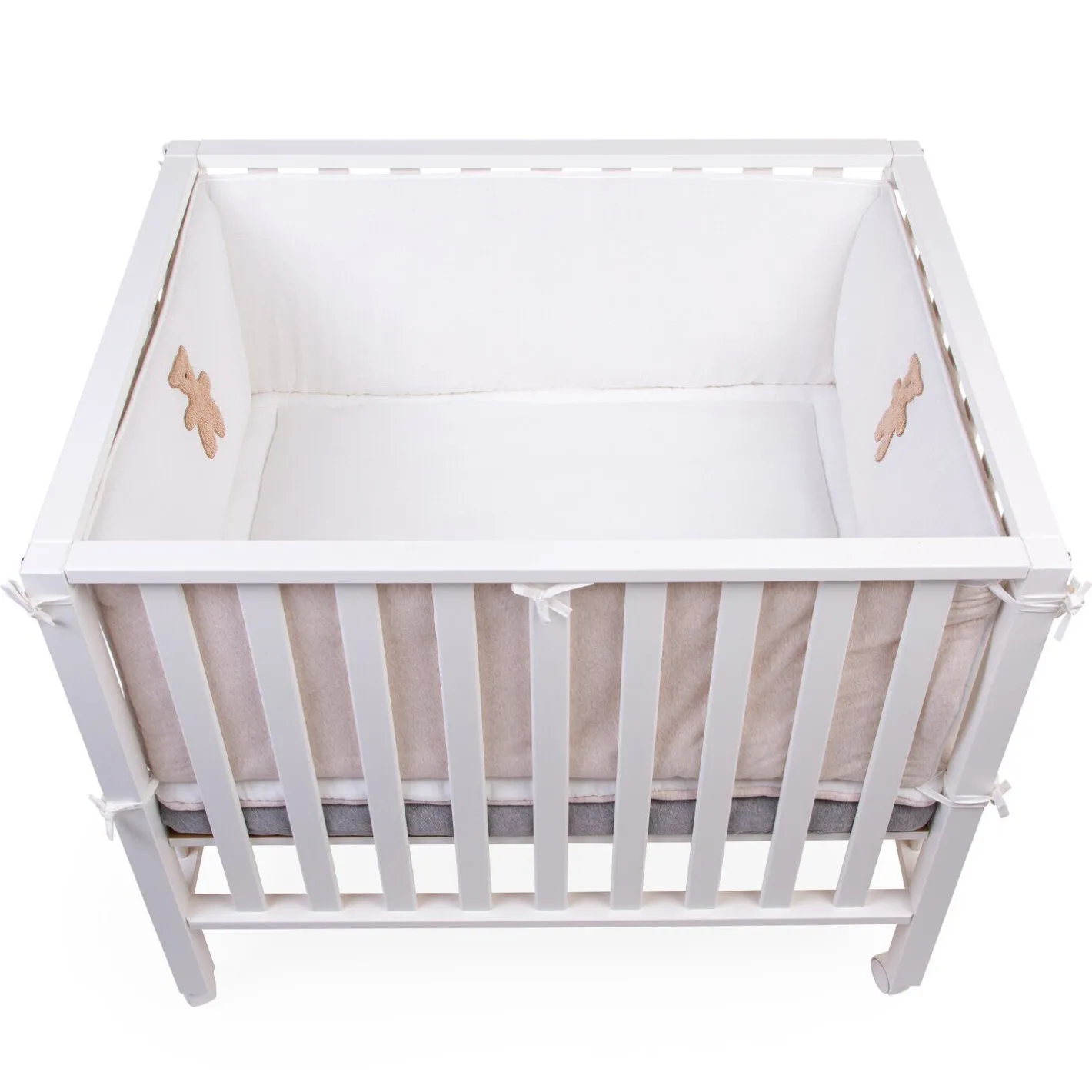Protection de parc pour bébé ultra-douce en jersey et mousseline de coton de haute qualité. La protection de parc peut être utilisée des deux faces. Un côté est de couleur beige et l’autre côté est de couleur mousseline. La protection de parc s’attache facilement aux barreaux du parc avec des rubans, ainsi votre enfant peut jouer ou rouler dans le parc sans soucis.